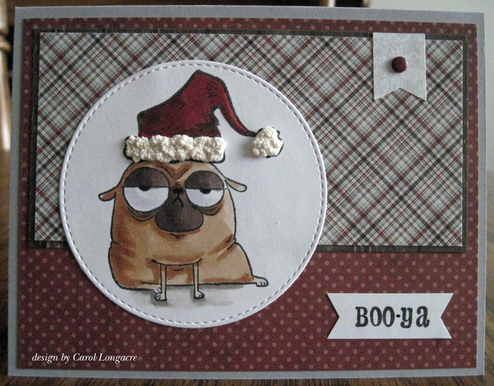 So cute, Carol! Your little pug might look grumpy but this is sure to bring a smile to the recipient! I love your coloring and the puffy hat! I will just say that I too still have some of this same paper in my stash from long ago! Never thought to use it for a Christmas card! I might just have to give that idea a try! Thanks!